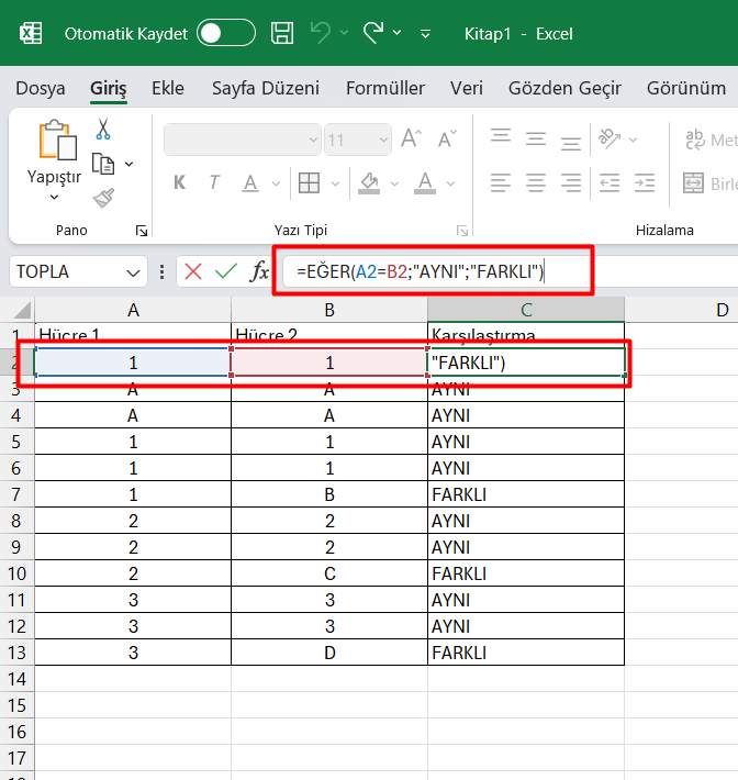 Excelde Sütunları Eğer Formülü ile Karşılaştırma (eğer)