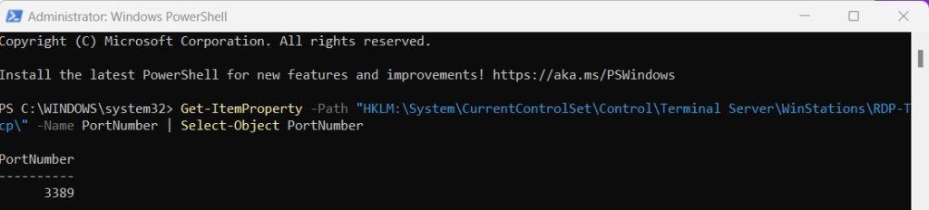 Get-ItemProperty -Path “HKLM:\System\CurrentControlSet\Control\Terminal Server\WinStations\RDP-Tcp\” -Name PortNumber | Select-Object PortNumber